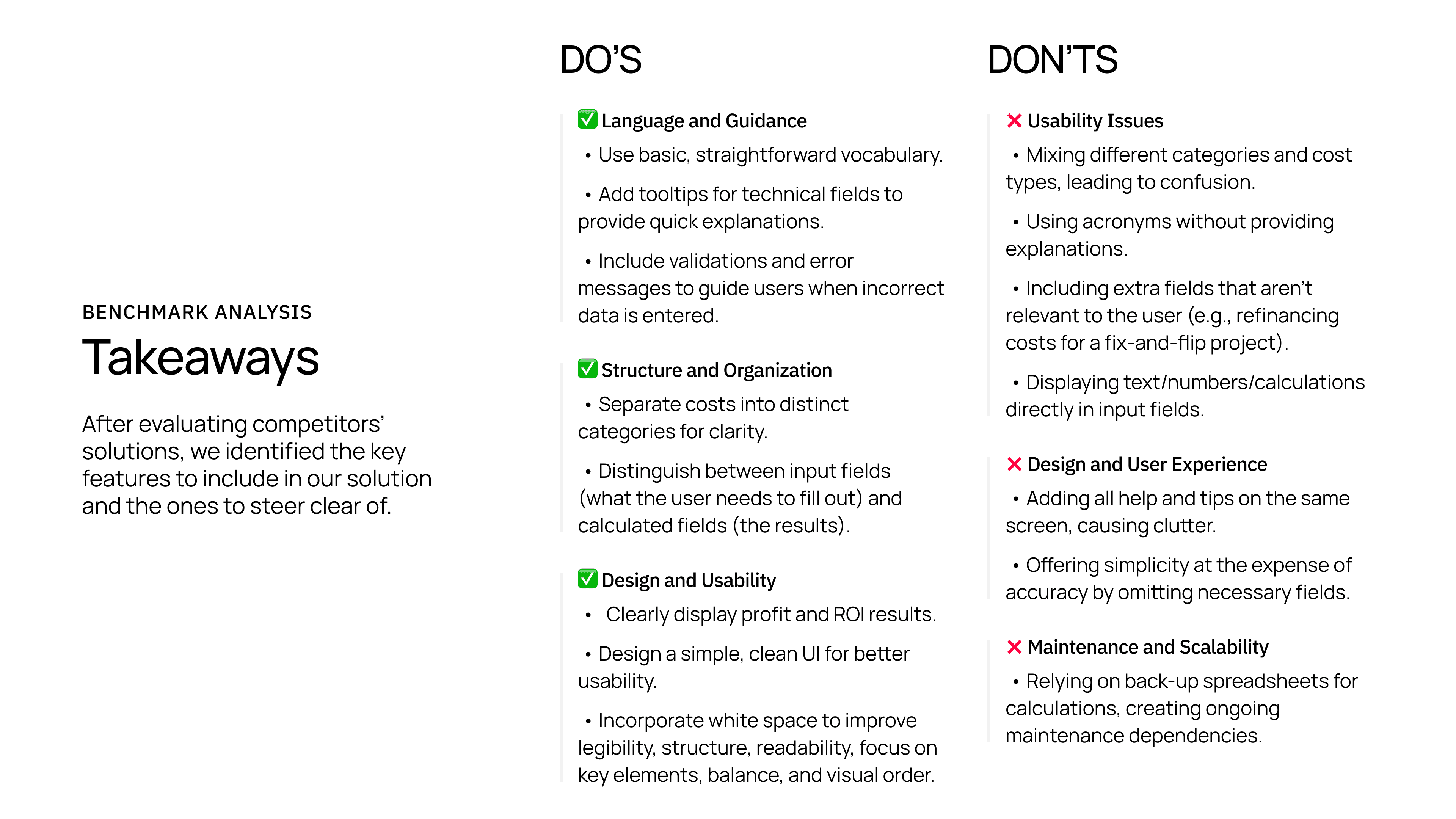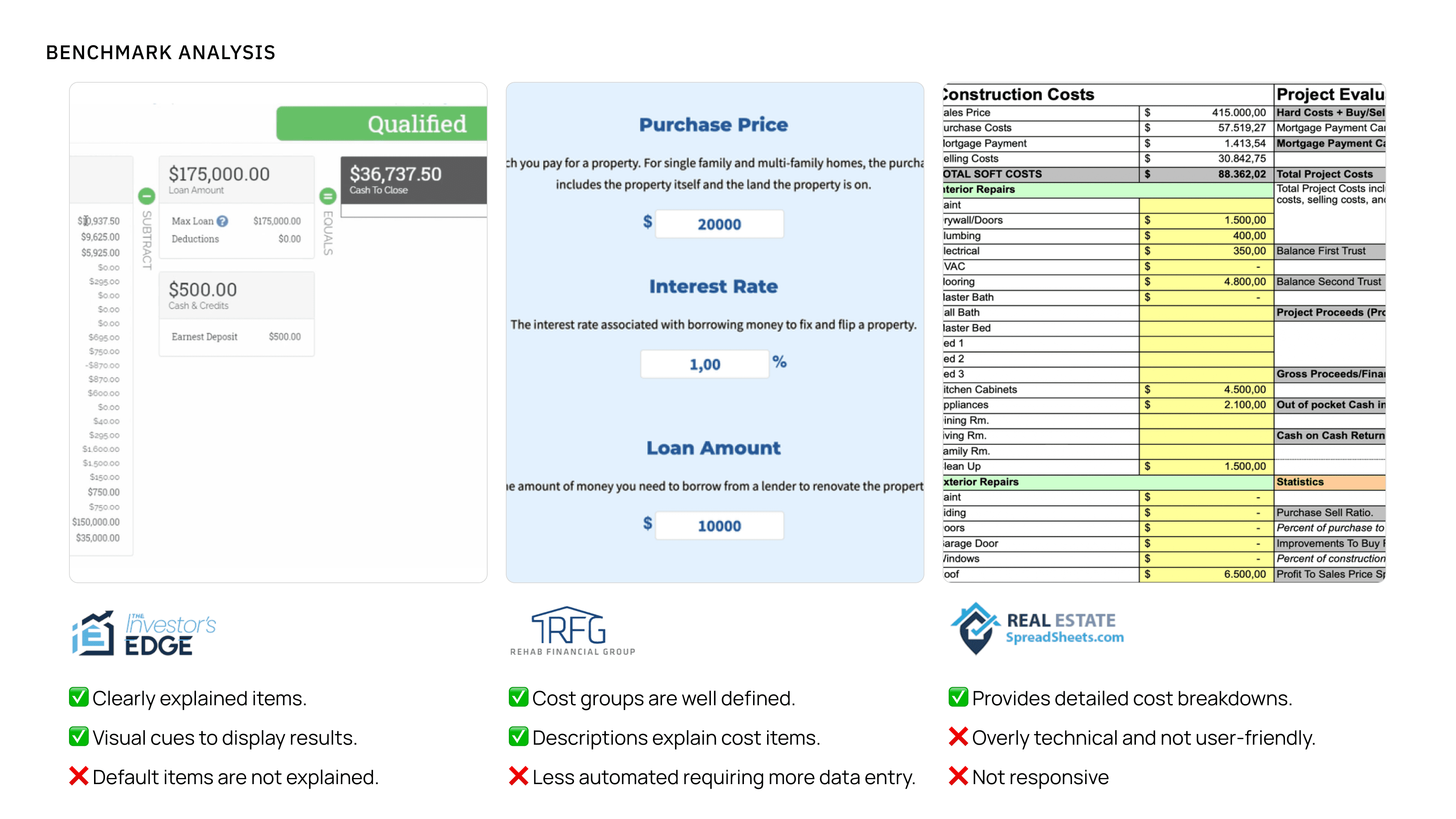 From there, I went into full benchmarking mode, analyzing competitors to see what other solutions were available to investors tackling fix-and-flip projects. I evaluated their strengths and weaknesses and discussed my findings with the founders to identify opportunities we could adapt and improve upon.